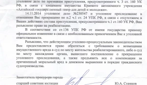 Прокуратура Барнаула официально извинилась перед бывшим директором Молодежного театра Алтая Татьяной Козицыной, которую обвиняли в хищении имущества с использованием служебного положения, за необоснованное привлечение к уголовной ответственности. Копия документа за подписью зампрокурора города имеется в распоряжении редакции.