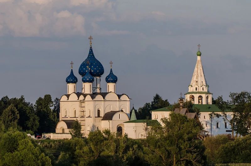 Начать маршрут удобно с Суздальского кремля — одного из самых узнаваемых памятников города. На его территории находится Рождественский собор с характерными голубыми куполами и древними архитектурными элементами. Рядом расположен Архиерейский двор, где можно увидеть экспозиции, посвященные истории города и церковному искусству.