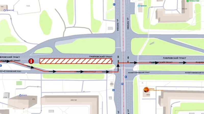 Машинам, которые будут ехать от ул. Солнечная Поляна в направлении ул. Георгиева, потребуется свернуть вправо на малый участок Павловского тракта, затем снова выехать на главную дорогу по временной разметке около пересечения с ул. Попова.