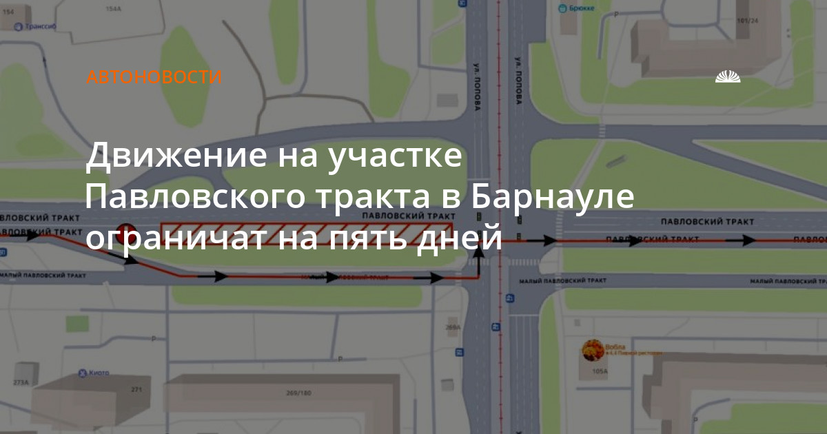 С 22:00 25 августа ограничат движения по нечетной стороне Павловского тракта на пересечении с ул. Попова, работы завершатся до 30 августа.