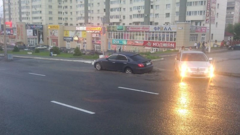 Иномарка ехала по Красноармейскому и провалилась в яму, которая была засыпана щебнем. Очевидно, что накануне на этом месте велись коммунальные работы.
