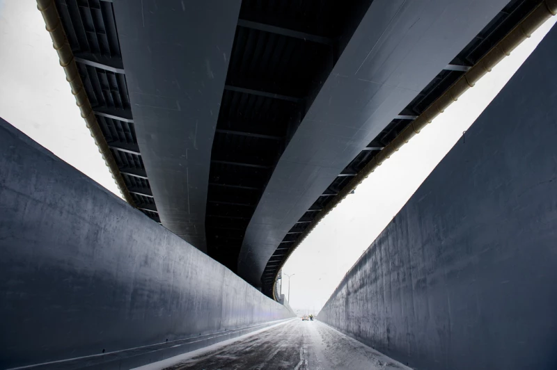 1. Нижний ярус развязки, выполненный в виде тоннеля, укреплен подпорными стенками. Часть из них – из прочных светопрозрачных конструкций.