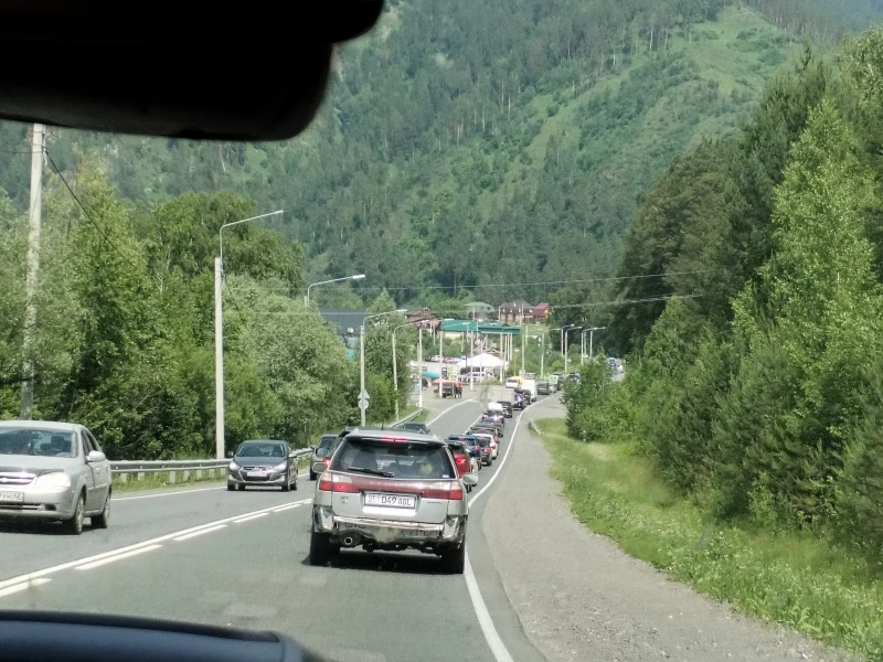Огромная пробка образовалась сразу после поворота в Чемал — там, где начинается территория Чемальского района. Судя по прошлогоднему опыту, затор тянется вплоть до Манжерока. Зато ранее возникшая пробка в Баранголе уже исчезла.