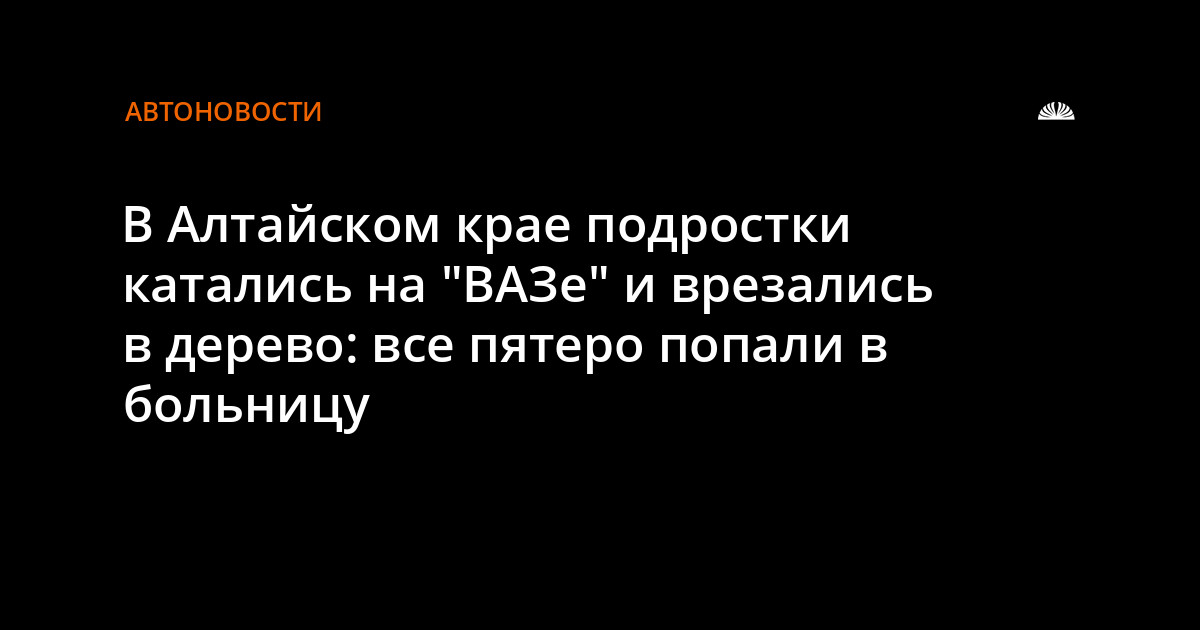 Пресс-служба ГУ МВД России по Алтайскому краю сообщает: "Предварительно установлено, что несовершеннолетний водитель 1999 года рождения, управляя автомобилем "ВАЗ", не справился с управлением и допустил наезд на дерево. В результате дорожно-транспортного происшествия водитель автомобиля, а также четыре несовершеннолетних пассажира 15-16 лет получили телесные повреждения различной степени тяжести. Все пострадавшие доставлены в Косихинскую центральную районную больницу для оказания медицинской помощи".