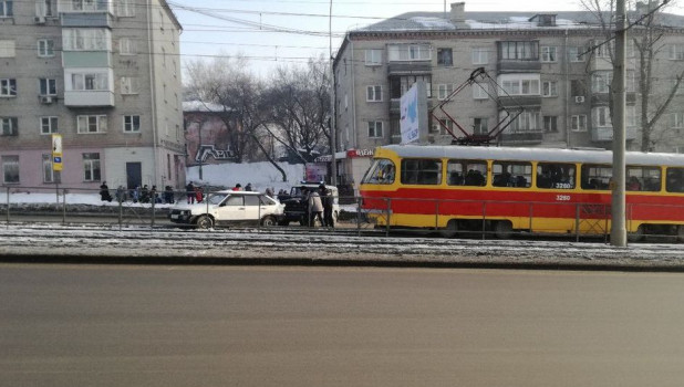 В Барнауле утром 13 февраля автомобиль ВАЗ-2109 выехал на трамвайные пути и застрял.