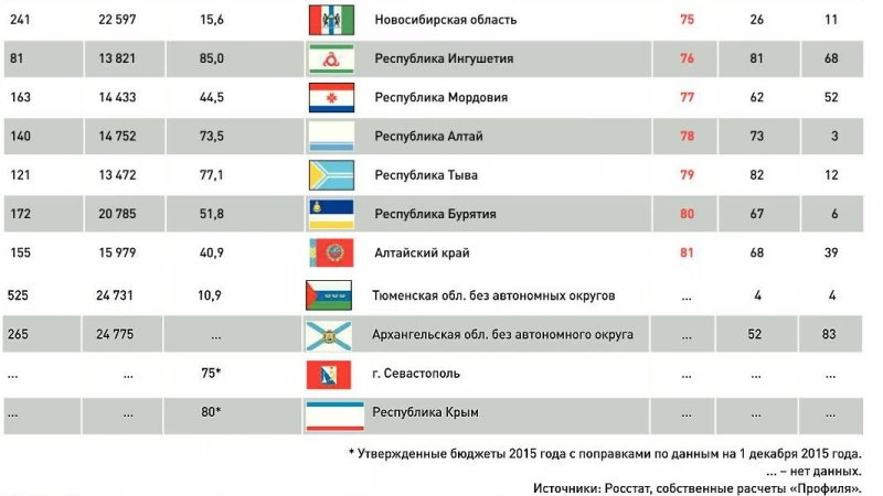 Алтайского края нет ни в списке "легко отделавшихся" регионов, ни в списке тяжело пострадавших субъектов. Составлять полный сводный список издание не сочло нужным. Зато "Профиль" опубликовал таблицу рейтинга российских регионов, где свел данные о ВВП, среднедушевых доходах, уровне дотационности бюджета, уровне жизни населения, уровне экономического развития и экономической динамике. И Республика Алтай, и Алтайский край оказались в конце этого списка, причем наш регион занял самое последнее место.