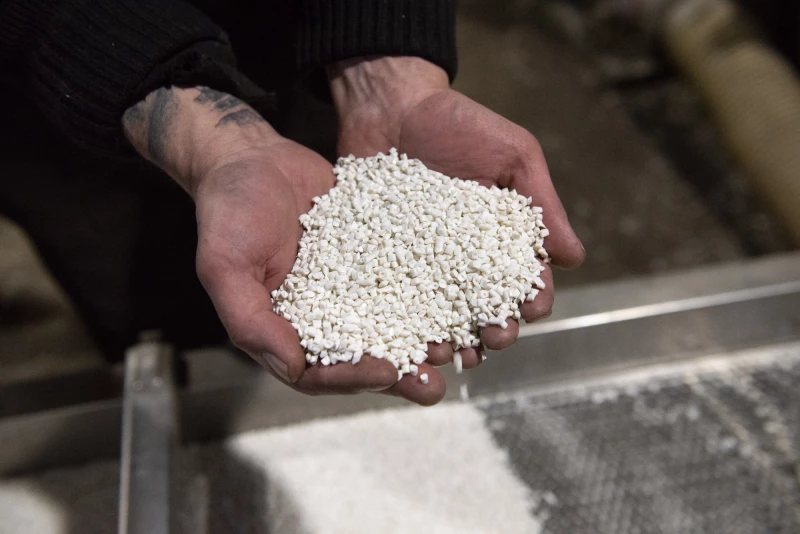 На выходе получаются непрерывные горячие пластиковые «спагетти», которые в новеньком грануляторе нарезаются на маленькие ровные гранулы. Их фасуют по мешкам и отправляют заказчику, который далее распределяет продукт по производствам партнеров.