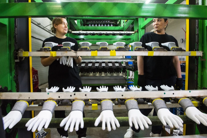 Не отвлекаем работников и движемся дальше. Выходим из основного здания и подходим к соседнему, с яркой надписью Manipula Specialist. Этот цех, а если быть точнее, целый отдельный корпус, специально построенный под расширение, предприятие посвятило обливным перчаткам, востребованным в различных отраслях. Ранее подобную продукцию поставляли из-за рубежа.