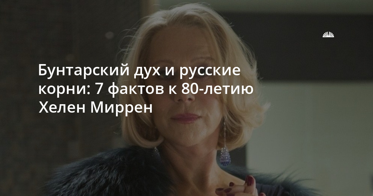 1. Английская актриса Хелен Миррен, урождённая Елена Васильевна Миронова, родилась 26 июля 1945 года в Лондоне в семье русского эмигранта, который в середине 1950-х годов изменил фамилию Миронов на Миррен. Дедушка по отцовской линии был убеждённым монархистом и работал в Лондоне на поставках оружия для русской армии. Он не принял революцию 1917 года и остался жить на Туманном Альбионе. Некоторое время назад актриса приезжала в Россию, чтобы познакомиться с историей своего рода и встретиться с родственниками.