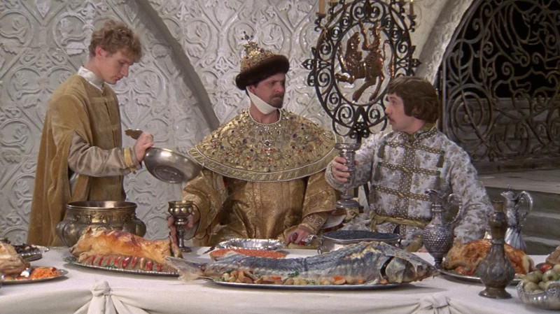 Пожалуй, самая запоминающаяся трапеза - в комедии «Иван Васильевич меняет профессию». После начала съёмок режиссёр захотел, чтобы все яства, появляющиеся на столах, были настоящими, а не бутафорскими: и заячьи почки, и ассорти из икры, и поросята, и щучьи головы, и даже осетры, за которыми пришлось гоняться по всей Москве. Но такая статья расходов не была заложена в бюджет! Тогда Гайдай решил платить за всё сам. Банкет обошёлся ему в 200 рублей, поэтому пришлось зорко следить за сохранностью съедобного реквизита. По легенде, он даже решил обработать его то ли соляркой, то ли олифой. Хотя под мощными осветительными приборами и опрыскивать реквизит ничем не надо: из-за жары любая осетрина быстро становится «второй свежести», как писал Булгаков, и вряд ли кто-то соблазнится её попробовать. Зато как аппетитно всё смотрится в кадре - так и хочется потребовать продолжения банкета!