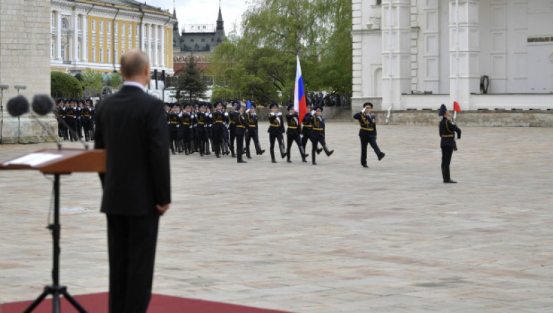 9 мая президент РФ Владимир Путин принял участие и в смотре марша караулов Президентского полка. Он выступил перед пешим и конным караулом.