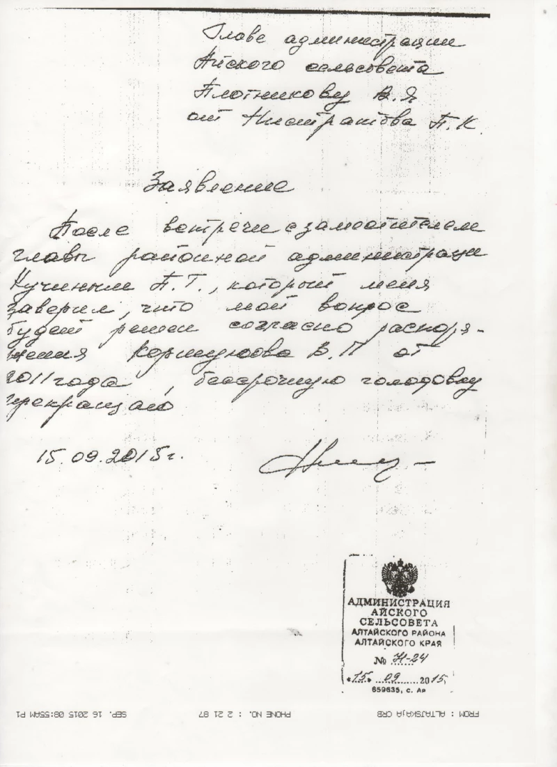 После встречи с заместителем главы районной администрации Кучиным П.Г., который меня заверил, что мой вопрос будет решен согласно распоряжения Коршунова В.П. от 2011 года, бессрочную голодовку прекращаю.