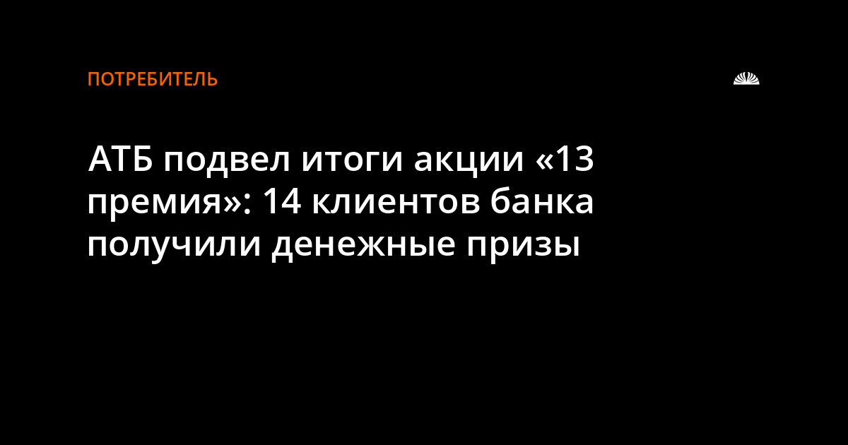 Акция «13 премия» проводится в Азиатско-Тихоокеанском банке с ноября 2016 года. За все время победителями акции стали более 80 клиентов АТБ по всей территории присутствия банка, сумма выплаченных бонусов – 1,2 млн рублей.