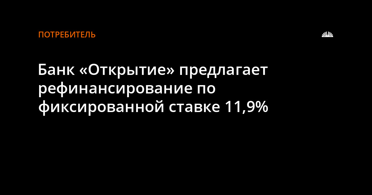 Участники Акции - физические лица. Целевое использование Кредита - рефинансирование кредитов сторонних банков: кредит наличными (аннуитет); автокредит (аннуитет); ипотека (аннуитет) и недоступно рефинансирование следующих кредитов: оформленных в ПАО Банк «ФК Открытие»; полученных на развитие бизнеса; кредитные карты. Сумма кредита: от 200000-5000000 рублей РФ (для зарплатных клиентов); от 200000–3 000 000 рублей РФ (для прочих клиентов). Сумма задолженности по каждому рефинансируемому кредиту неменее 50000 рублей РФ. Процентная ставка: 11,9% годовых. Условия получения кредита в рамках Акции: 1. Продолжительность обслуживанияхотя бы одного кредита (в том числе закрытого) должна составлятьболее12 месяцев; 2. Сумма платежей по кредитам после рефинансирования кредитовне превышает сумму текущих платежей клиента; 3.Отсутствие просроченной задолженности любой длительности за последние 12 месяцев; 4. Отсутствие просроченной задолженности более 30 дней по всем кредитам, в том числе закрытым; 5. Отсутствуют кредиты, оформленные позднее, чем 6 месяцев назад; 6.Отсутствие микрокредитов, в том числе закрытых. Перечень документов смотрите здесь.