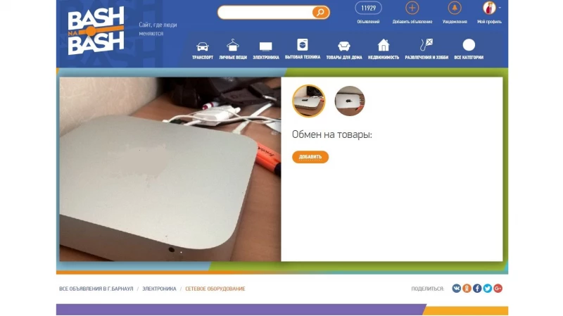 Реальность: Я увидел на сайте счетчик, который показывал почти 12 тысяч объявлений. География "Баш на Баш" довольно широка - представлена вся Россия от Калининграда до Владивостока. Из рубрик сайта есть все для меня необходимое: "Транспорт", "Личные вещи", "Электроника", "Бытовая техника", "Товары для дома", "Недвижимость", "Услуги", "Развлечения и хобби". Правда, меня смутил раздел "Услуги", так как он был не активный и мне не удалось просмотреть его содержание. Видимо, он еще в процессе разработки. Значит, сайт живет и развивается, что не может не радовать. В разделе "Электроника" я нашел несколько ноутбуков, которые мне понравились. Предложил им всем меняться и стал ждать ответного звонка.