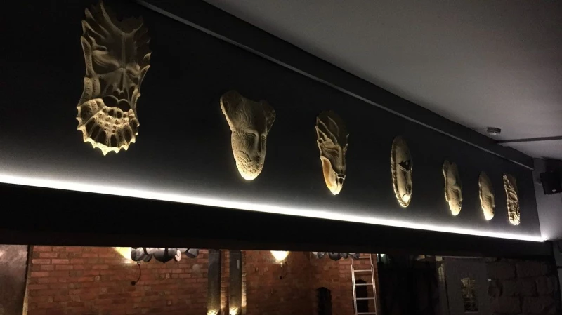 На место рыцарской мистики пришел современный стиль: прозрачные стулья, большие люстры, яркие текстильные диваны, дубовые столы. Не тронули при редизайне кирпичную стену с фресками Никодима Лейбгама.