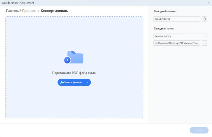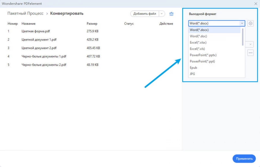 Пакетная обработка — это процесс применения набора сохраненных (предварительно настроенных) операций к одному или нескольким PDF-файлам. Впоследствии, преобразованные объекты, будут сохранены в заданном дисковом пространстве. Для того чтобы превратить, например, сразу 10 документов формата Portable в Word, пользуясь программой Wondershare PDFelement, нужно:
