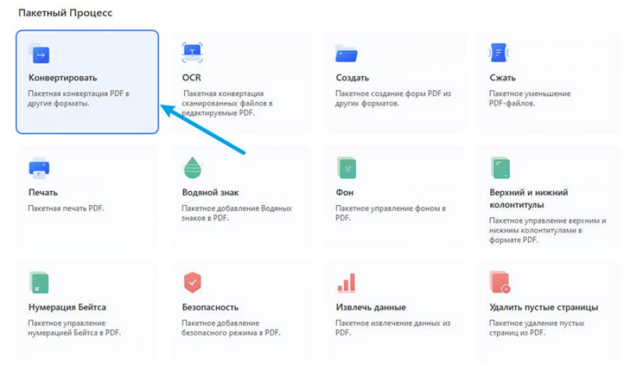 3. В разделе «Пакетный процесс» выбрать параметр «Конвертировать», для изменения формата нескольких документов одновременно.