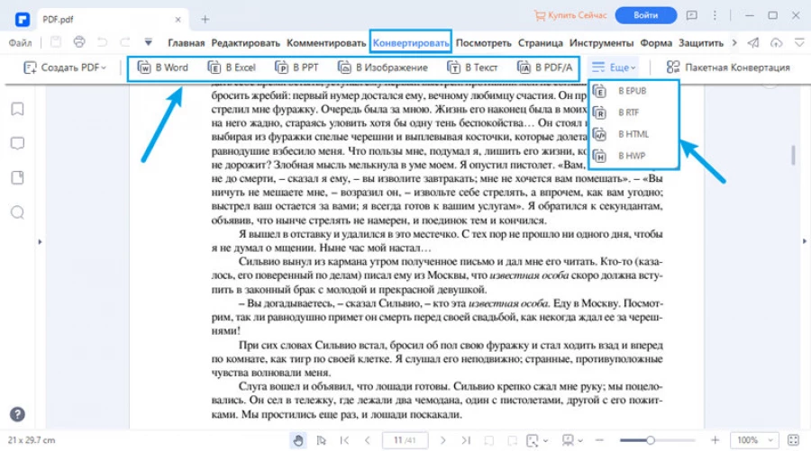 Есть и другой, не менее удобный способ конвертации. Нужно открыть цифровой бланк, пользуясь программой PDFelement, и отыскать соответствующую кнопку в верхнем навигационном меню. Софт самостоятельно предложит конечный формат перевода файла.