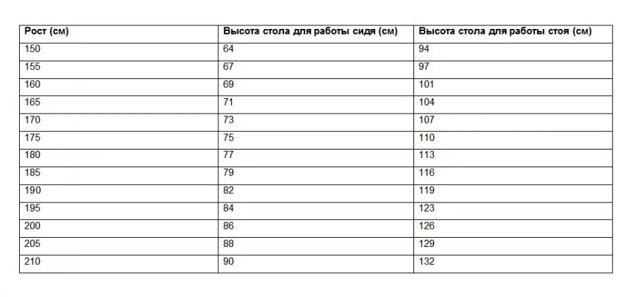 Главный принцип, который следует запомнить, заключается в том, что ваши руки должны лежать прямо на столе и подлокотниках, сгибаясь в локте примерно на 90 градусов, под прямым углом. Оптимальная высота письменного стола должна помочь сохранить эту позу, чтобы вы не поддавались желанию сутулиться. В таблице ниже приведены оптимальные показатели для разного роста: