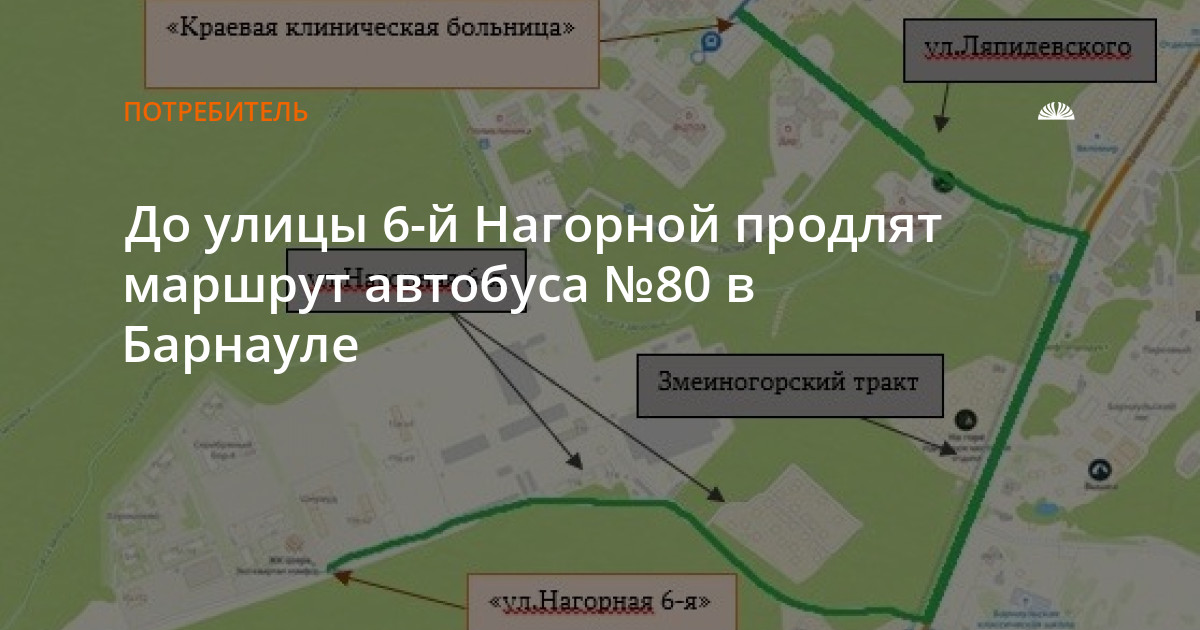 Теперь автобус №80 будет следовать в прямом направлении по улице Ляпидевского, Змеиногорскому тракту и до конечной остановки у дома №15г/11 на улице 6-й Нагорной.