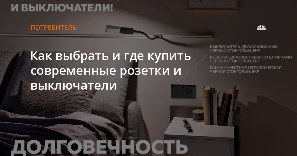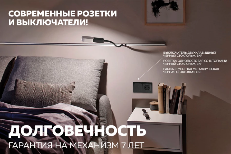 Долговечность. Строгие стандарты ГОСТ, современное производство и проверенные технологии позволяют создавать крепкие и надежные розетки и выключатели. Например, серия Стокгольм от EKF на 30% дешевле аналогичных предложений, а производитель дает гарантию на семь лет, что примерно в три раза дольше многих других.