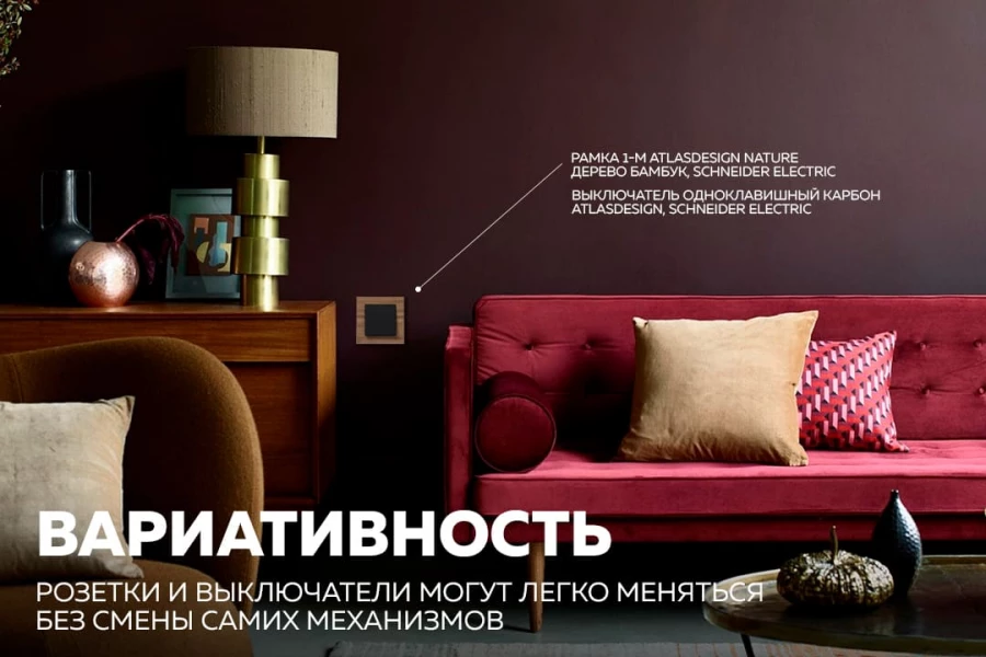 Вариативность. В современных коллекциях розетки и выключатели могут легко меняться по вашему желанию, без смены самих механизмов. Достаточно заменить рамки одного цвета на другой или с пластика на натуральные материалы, и весь интерьер может полностью преобразиться. При этом вам не понадобится больших вложений, не придется вызывать электрика, ведь сама розетка не нуждается в замене.