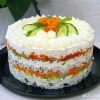 Автор сообщает, что готовит на заказ уже давно, а сейчас расширяет свой ассортимент. Так в меню появился торт с рыбой, рисом, нори, сыром и икрой. От традиционных роллов он отличается только видом. На вкус — филадельфия. Некоторые тортики покрыты кунжутом.