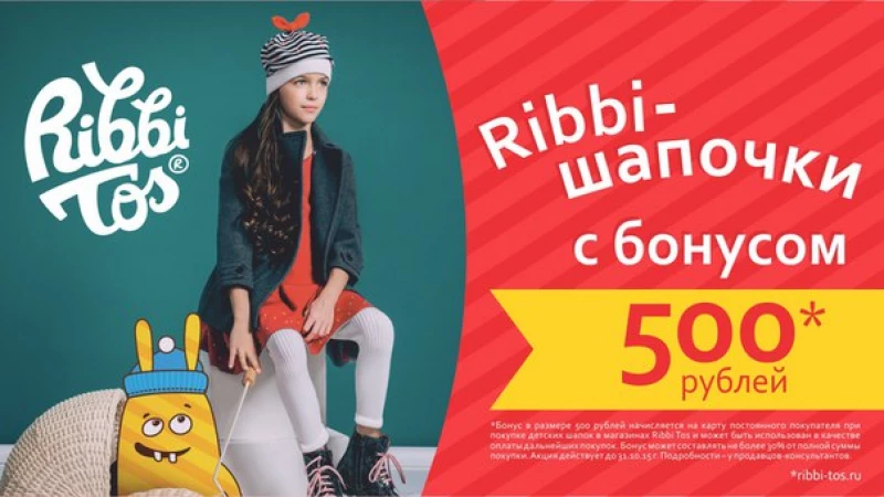 В сети магазинов детской одежды RibbiTos до конца октября покупателям теплых шапок и шлемов дарят бонус на следующую покупку. 500 рублей зачисляется на карту постоянного покупателя RibbiTos для погашения части следующих покупок. Акция проходит в ТРЦ "Арена" и ТЦ "Ультра".