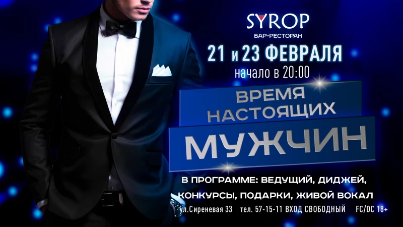 Уже 21 и 23 февраля в 20:00 гости смогут окунуться в атмосферу веселья на развлекательной программе «Время настоящих мужчин». Вечер пройдет в сопровождении ведущего, диджея и живого вокала.