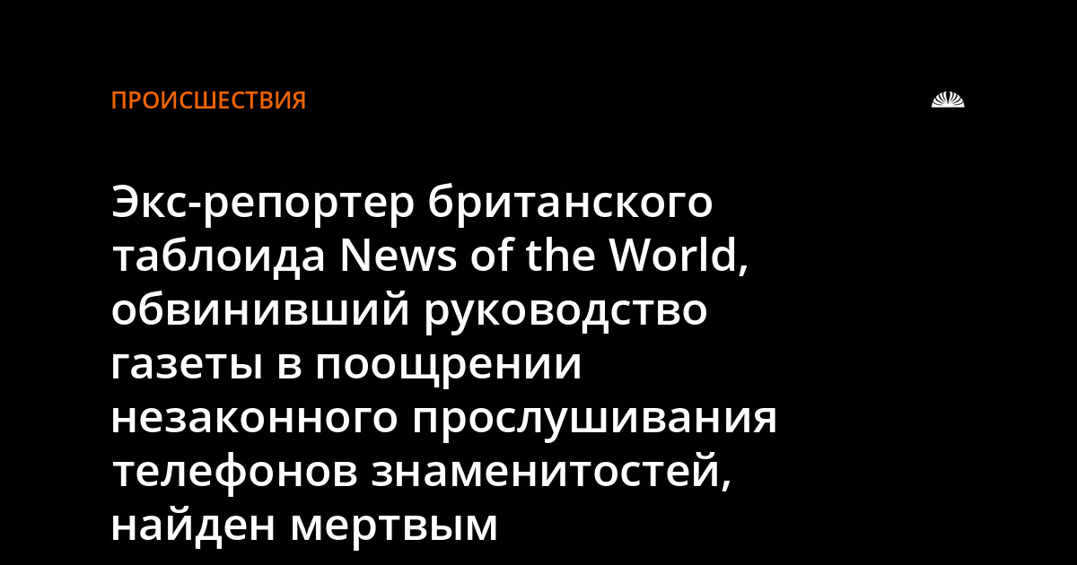 Шон Хоар, бывший репортер британской газеты, найден мертвым 18 июля в частном доме в Уотфорде – северо-западном пригороде Лондона. Ранее Хоар заявил в интервью газете New York Times, что практика прослушивания телефонов знаменитостей и жертв преступлений и их родственников в погоне за историями была гораздо более распространенной, чем редакция NoW это признавала ранее - передает www.bbc.co.uk.