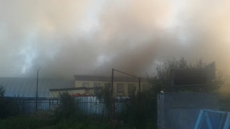 Горит здание по адресу ул. Промышленная, 14. Здесь располагается фирма "СибРиал", которая занимается переработкой и консервированием овощей.