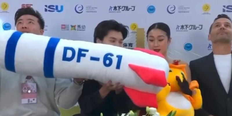 На трансляции соревнований засняли момент в зоне kiss and cry, где китайцы Жэнь Цзюньфэй и Син Цзянин находились рядом с крупной мягкой игрушкой в виде ракеты с маркировкой DF-61, пишет РБК.