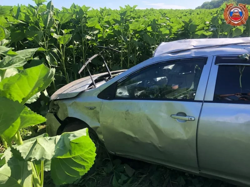 В результате потери контроля над автомобилем Toyota Corolla съехала с дороги в поле подсолнечника, где и перевернулась. В машине находились двое несовершеннолетних пассажиров — дети 12 и 4 лет.