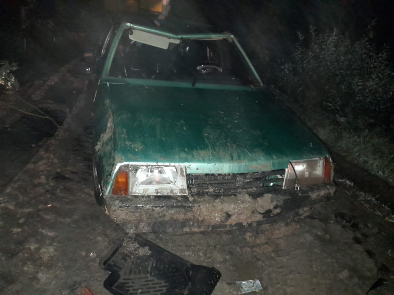 Автомобиль съехал с дороги, опрокинулся и попал в кювет, который был наполнен водой.