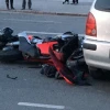 Когда машина стала разворачиваться, парень на мотоцикле ускорялся, а потом резко затормозил. Заднее колесо поднялось вверх и байк выкинул парня, а потом еще и "догнал" его.