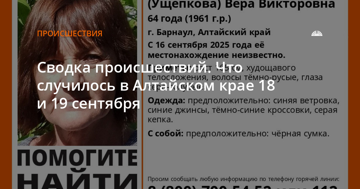 - В Барнауле 16 сентября пропала 64-летняя Вера Укранчук (Ущепкова). Женщина ростом 165 см, худощавого телосложения, волосы темно-русые, глаза светло-голубые.