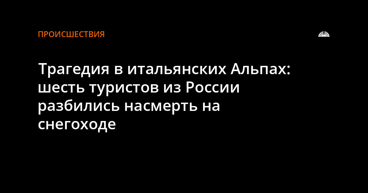 Итальянские СМИ сообщают в субботу, 5 января, о том, что группа из восьми туристов, предположительно россиян или поляков, накануне вечером разбились на снегоходе в итальянских Альпах. В результате этой аварии в северо-итальянской области Трентино-Альто-Адидже погибли шесть человек - 4 мужчины и 2 женщины. Еще двое туристов в критическом состоянии госпитализированы на военном вертолете.