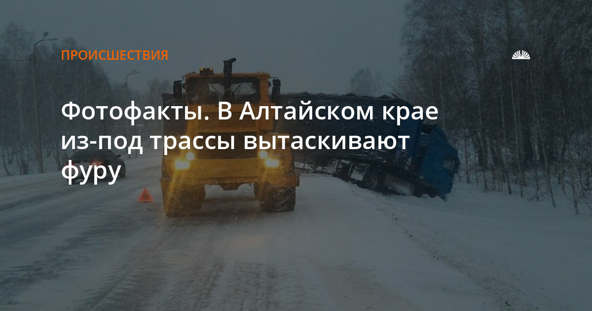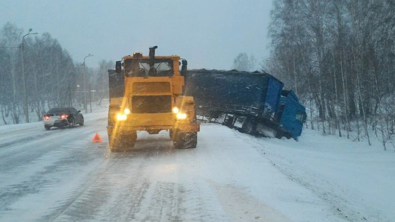 На трассе М-52 в районе села Баюновские Ключи с трассы слетела фура. Машину вытаскивает грузовой транспорт, к работам подключились военные, сообщают очевидцы в Barnaul 22.