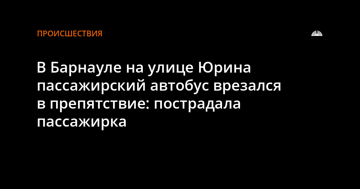 По информации УМВД России по Алтайскому краю, 25 марта в 18.15 на улице Юрина, 222 в Барнауле произошло дорожно-транспортное происшествие с участием автобуса 60 маршрута - водитель не справился с управлением и допустил наезд на препятствие.