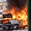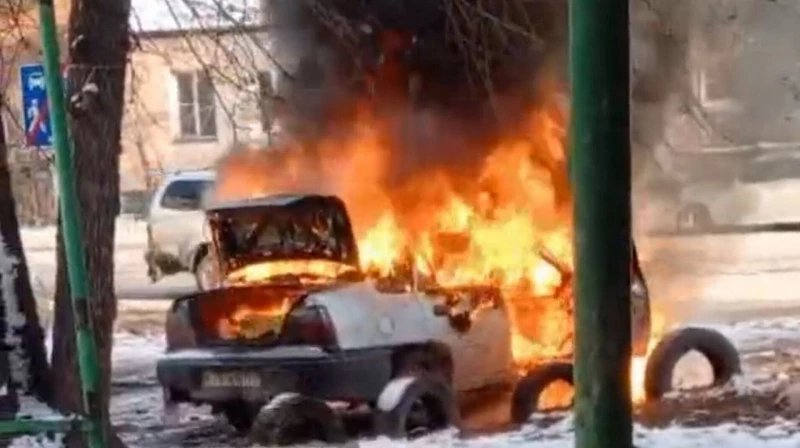 Пламя быстро поглотило автомобиль. Столбы густого дыма поднимались к крышам многоэтажек.