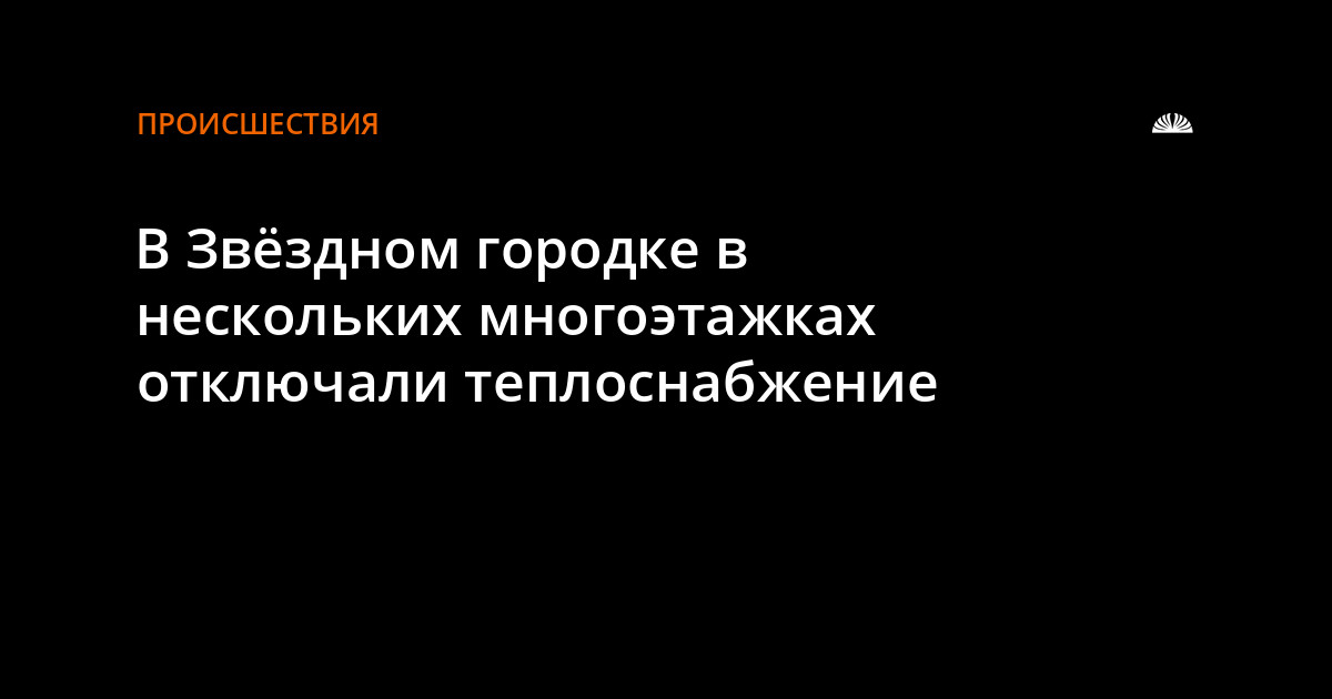 В 12.46 (мск.) 3 января в Московской области на территории ЗАТО "Звездный городок" произошло нарушение теплоснабжения в 9 многоэтажных домах с населением около 3000 чел. Проводятся аварийно-восстановительные работы, которые планируется завершить к 17.00 (мск.) 3 января, сообщается на сайте МЧС России.
