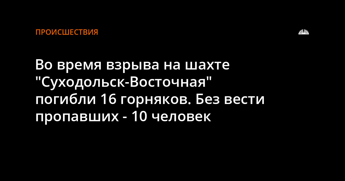 29 июля в 01.57 (время местное) в городе Суходольск Краснодонского района на шахте "Суходольск-Восточная" на горизонте 915 м произошел взрыв. По предварительным данным, погибли 16 человек и 2 горняка с ожогами и травмами разных степеней тяжести госпитализированы. Всего на аварийном участке работало 28 горняков.