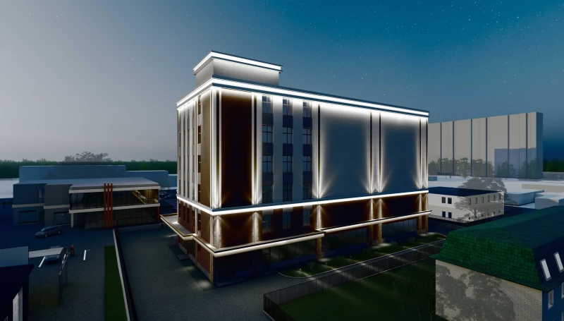 Фасад госархива будет сочетать стили соседних современных зданий и котельного завода. В отделке используют керамогранит, декоративные элементы из композитных материалов.