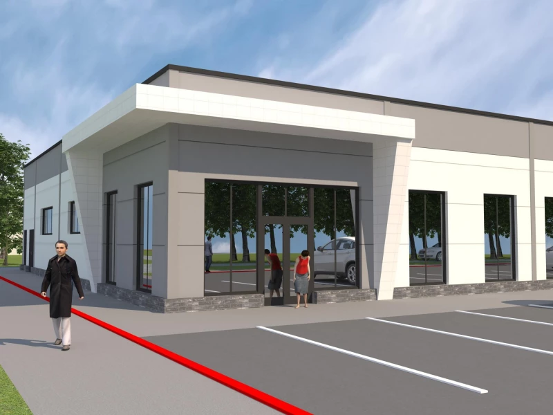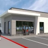 Здание спроектировали одноэтажным. Вход будет угловым, его выделят порталом. Отделка – сэндвич-панели и композитные материалы. Добавят витражное остекление.
