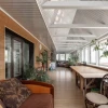 Пространство кухни-столовой-гостиной занимает площадь 48,3 м кв., зона кухни составляет 16,5 м кв., столовая и гостиная объединены общим пространством площадью 31,8 м кв. Пространство зонировано благодаря несущей колонне, сохраняя визуальную открытость помещения. Из столовой предусмотрен удобный выход на террасу площадью 46,7 м кв.