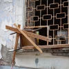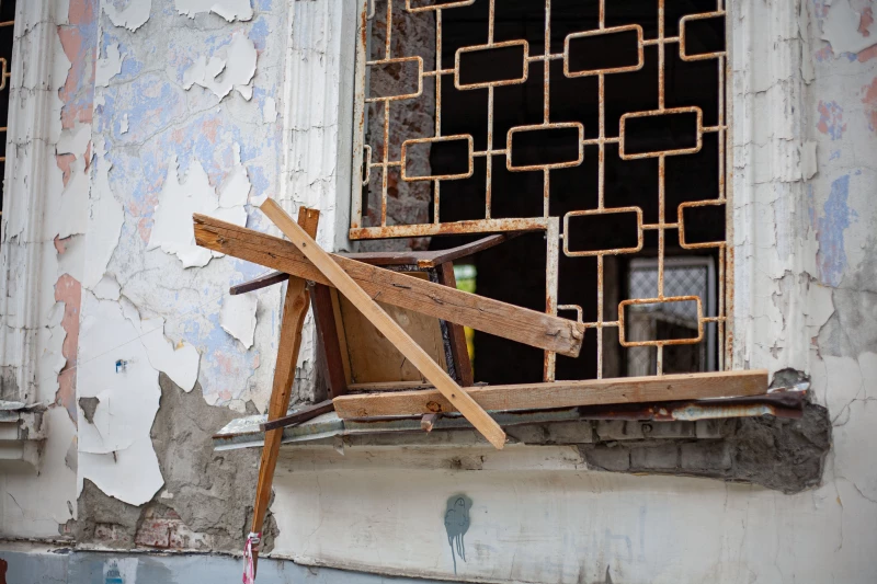 Здание оградили бетонными блоками с металлическими опорами под будущий забор. Работники разгребают завалы, убирают старые стекла и оконные рамы, а также вывозят строительный мусор.
