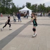 Команда девчонок лихо выполняла элементы фигурного катания на площадке около визит-центра.