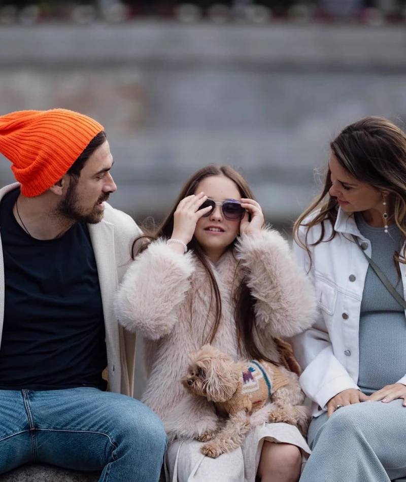 Агата Муцениеце выложила в своем блоге фотосессию в сером трикотаже, акцентирующем внимание на животе. Некоторые кадры запечатлели ее рядом с новым женихом, певцом Петром Дрангой, и дочерью Мией от предыдущего союза с Павлом Прилучным.