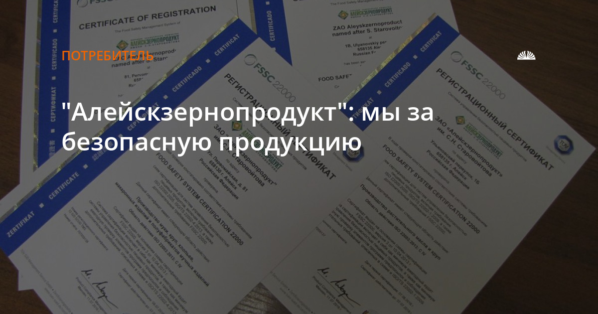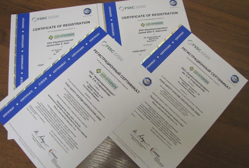 По итогам аудитов, независимым международным сертификационным органом "Алейскзернопродукту" были присвоены регистрационные сертификаты системы управления безопасностью пищевых продуктов. Сертификаты имеют следующую область действия: производство муки, круп, хлопьев, макаронных изделий и полуфабрикатов мучных изделий; производство растительного масла и круп. Сертификаты выданы на основании схемы сертификации FSSC 22000, версия 3 от 10.04.2013 г.